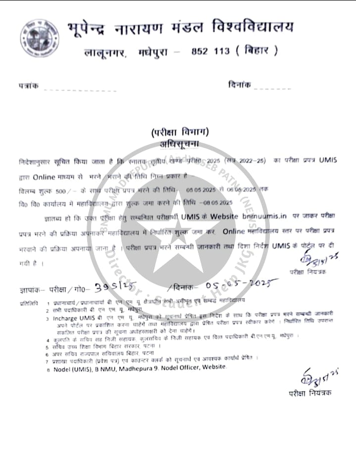 BNMU स्नातक 2022–25 पार्ट-3 के जो बच्चे फॉर्म भरने से वंचित रह गए थे।, उनके लिए 5 से 6 दो रोज फॉर्म भरने की तिथि बढ़ा दिए गए हैं, सभी छात्र-छात्राओं निर्धारित समय से अपना फार्म अवश्य भर लें।